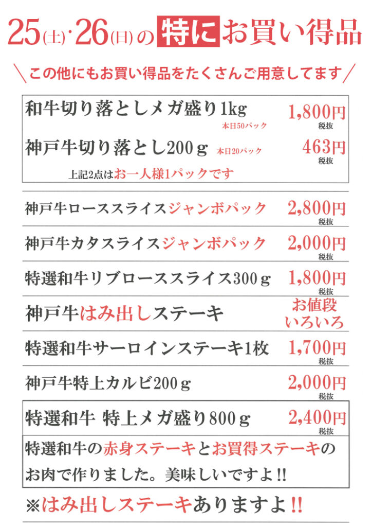 他にもステーキ用、焼肉用、すき焼き・しゃぶしゃぶ用、切り落としなどの各種高級お肉や、ここでしか買えないオリジナルの加工品を多数お買い得価格でご用意して、みなさまのご来場をお待ちしております😊