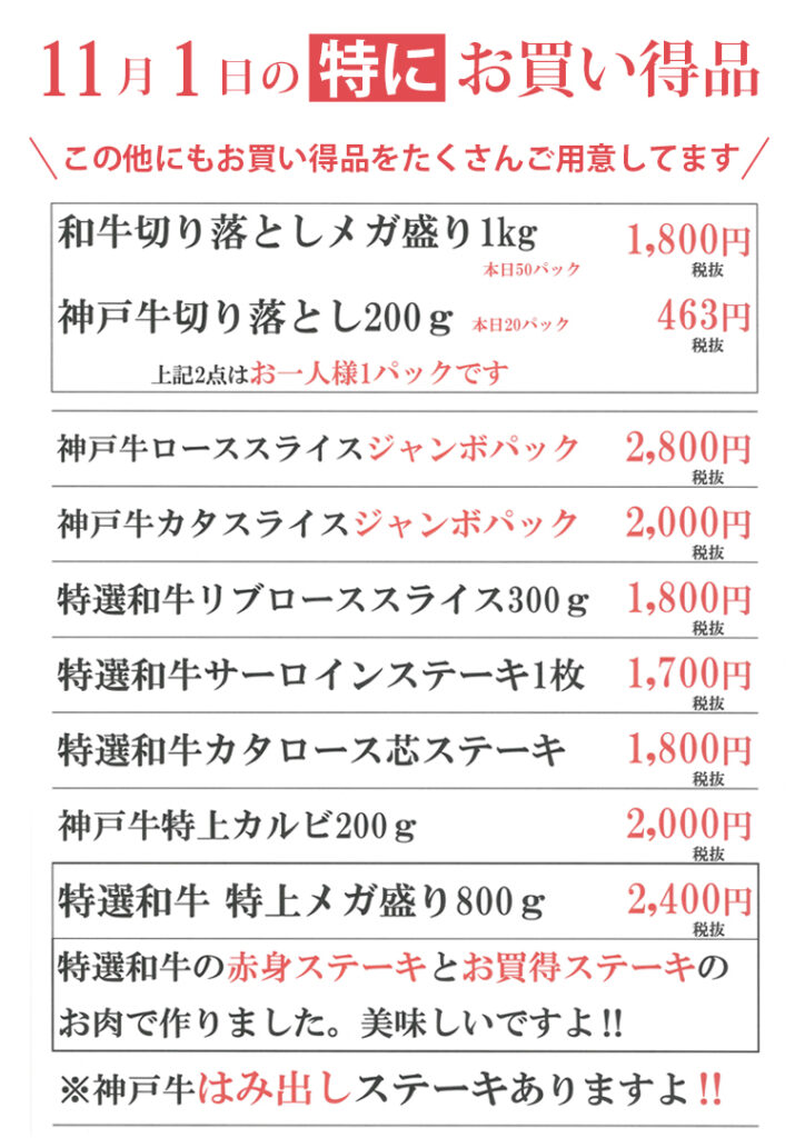 11月1日(土) 10時~12時『青空市』開催します! “通好みの希少部位” 特選 A5 黒毛和牛 カタロース芯ステーキがお買い得です!!