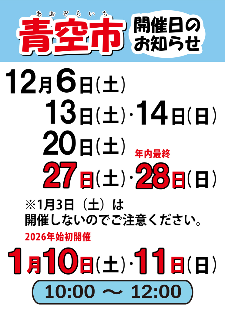 なお、上記日程を除き、毎週土曜日および第2・第4日曜日に開催しております。