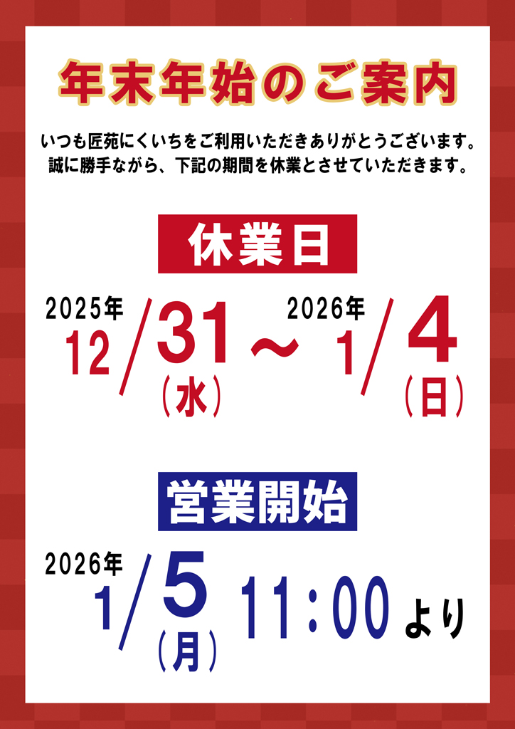 【年末年始営業時間のご案内】 工場直売所 青空市 / 匠苑にくいち戸田店 / 江戸匠苑(にくいち)押上店 / 神戸牛の通販サイト