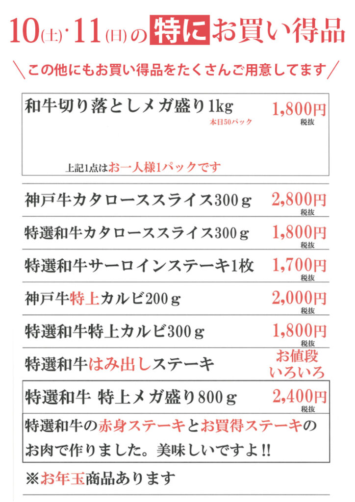 他にもすき焼き・しゃぶしゃぶ用、ステーキ用、焼肉用、切り落としなどの各種高級お肉や、ここでしか買えないオリジナルの加工品も多数、お買い得価格で取り揃えております。皆さまのご来場を心よりお待ちしております😊