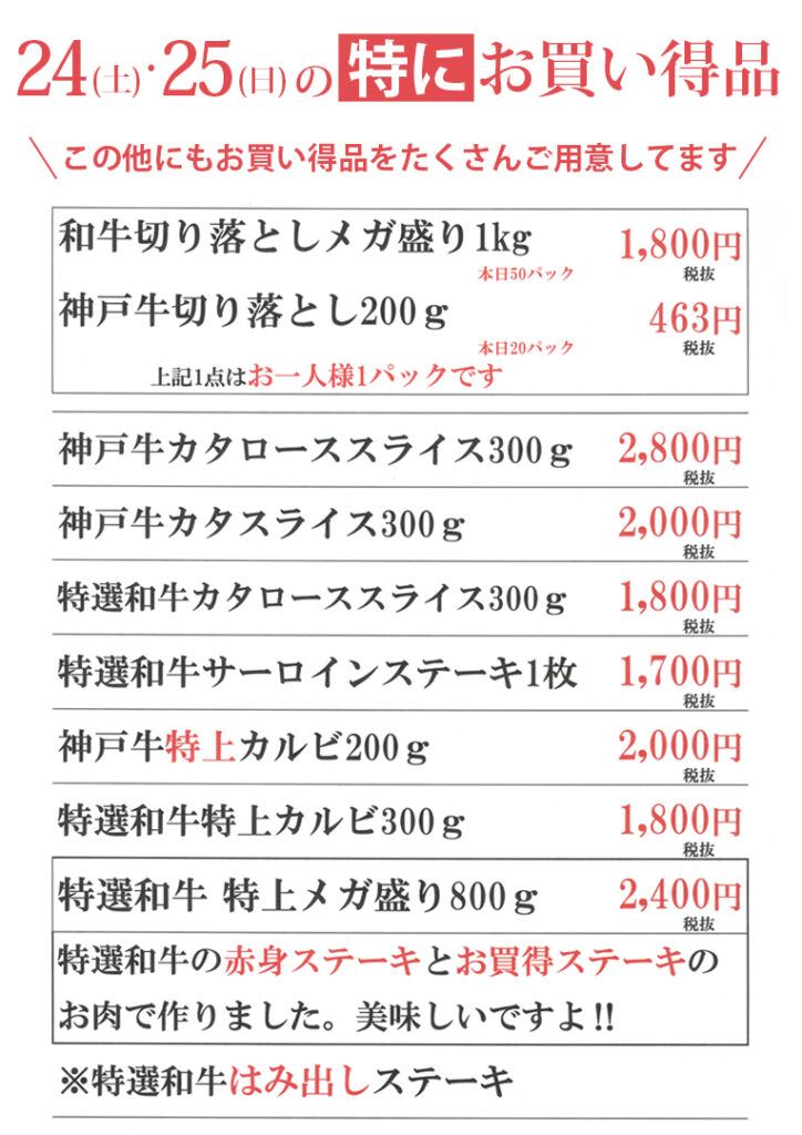 他にもすき焼き・しゃぶしゃぶ用、ステーキ用、焼肉用、切り落としなどの各種高級お肉や、ここでしか買えないオリジナルの加工品も多数、お買い得価格で取り揃えております。皆さまのご来場を心よりお待ちしております😊