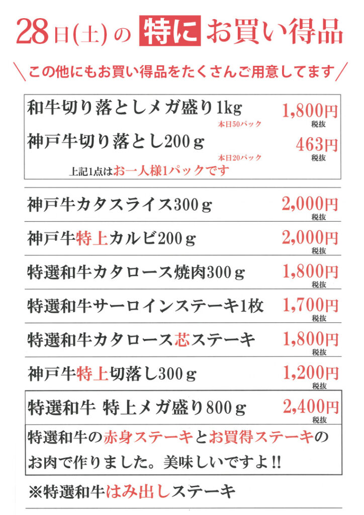 他にもすき焼き・しゃぶしゃぶ用、ステーキ用、焼肉用、切り落としなどの各種高級お肉や、ここでしか買えないオリジナルの加工品も多数、お買い得価格で取り揃えております。皆さまのご来場を心よりお待ちしております😊