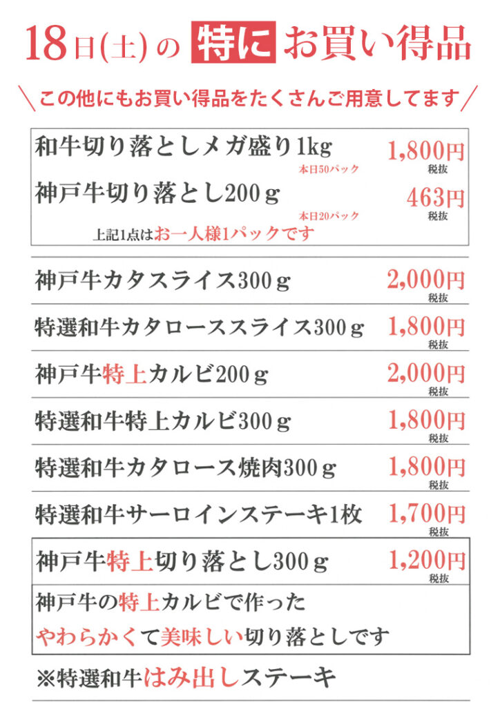 他にも焼肉用、ステーキ用、すき焼き・しゃぶしゃぶ用、切り落としなどの各種高級お肉や、ここでしか買えないオリジナルの加工品も多数、お買い得価格で取り揃えております。皆さまのご来場を心よりお待ちしております😊