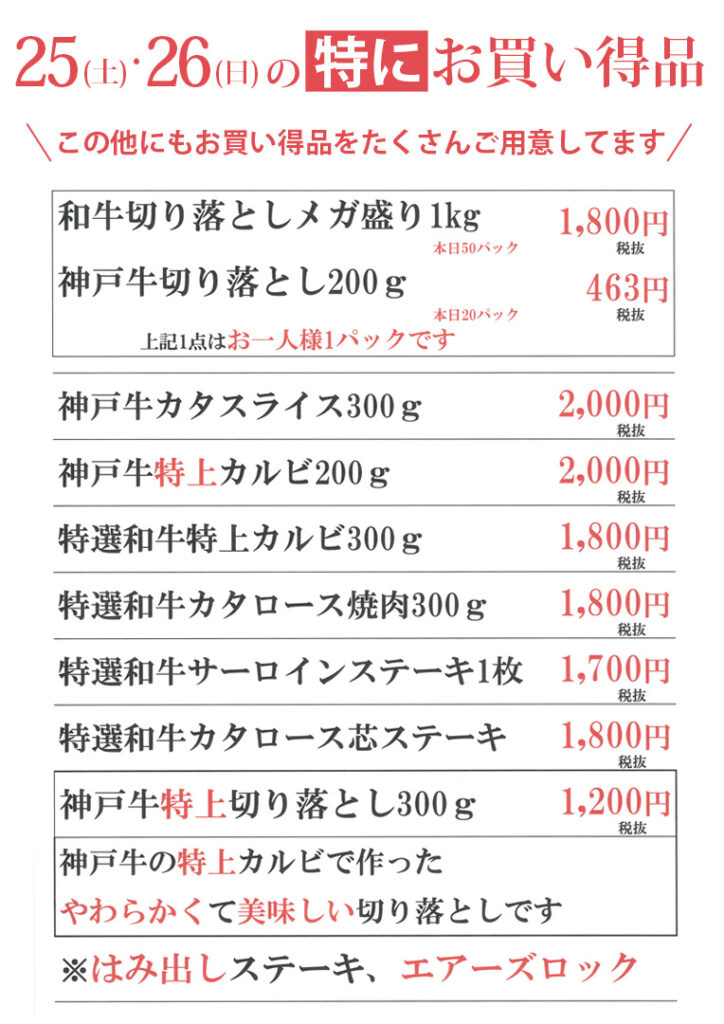 他にも焼肉用、ステーキ用、すき焼き・しゃぶしゃぶ用、切り落としなどの各種高級お肉や、ここでしか買えないオリジナルの加工品も多数、お買い得価格で取り揃えております。皆さまのご来場を心よりお待ちしております😊