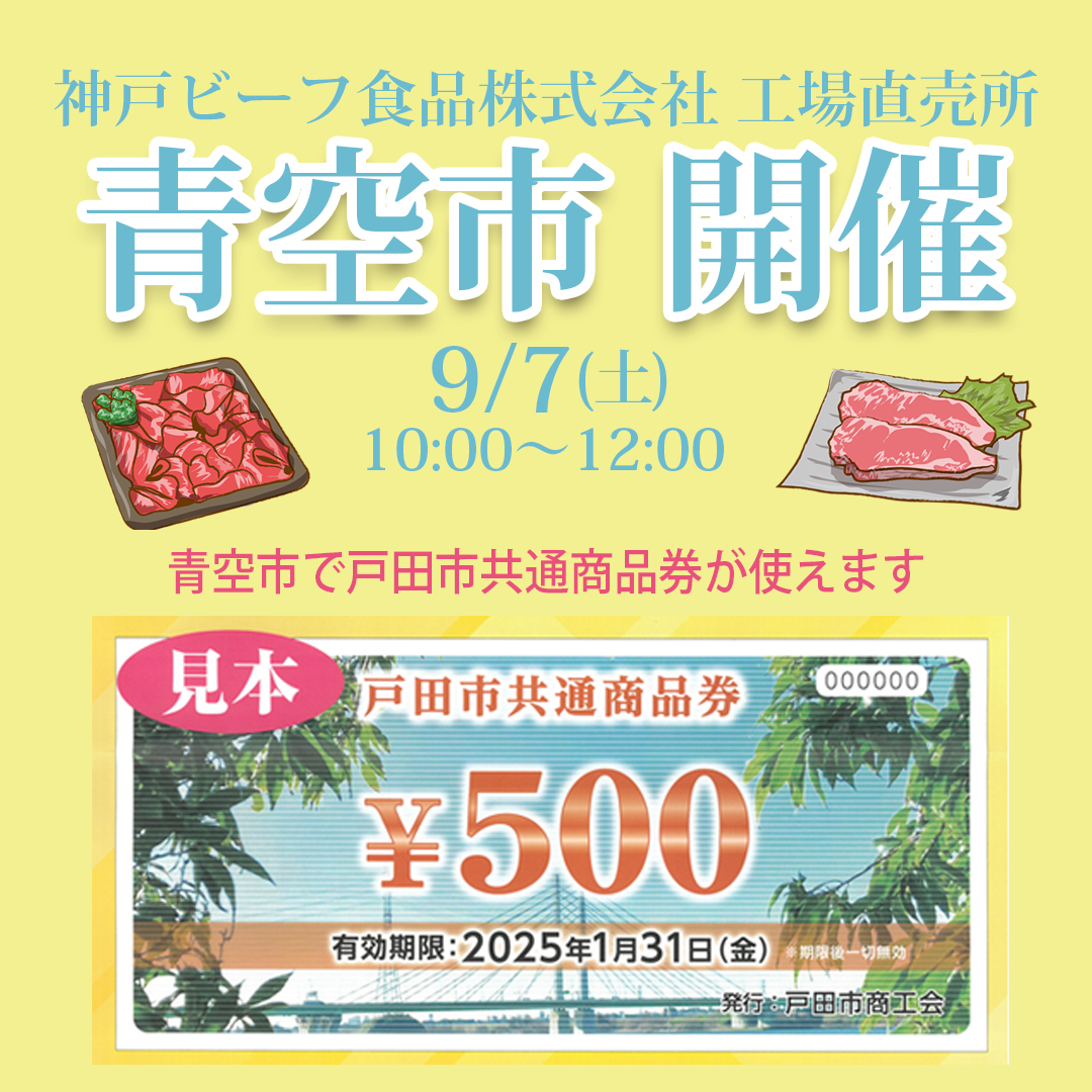 10月5日土曜日 10時から神戸ビーフ食品株式会社『青空市』開催します! 特選黒毛和牛 A5ランク 赤身ステーキがセール価格!!