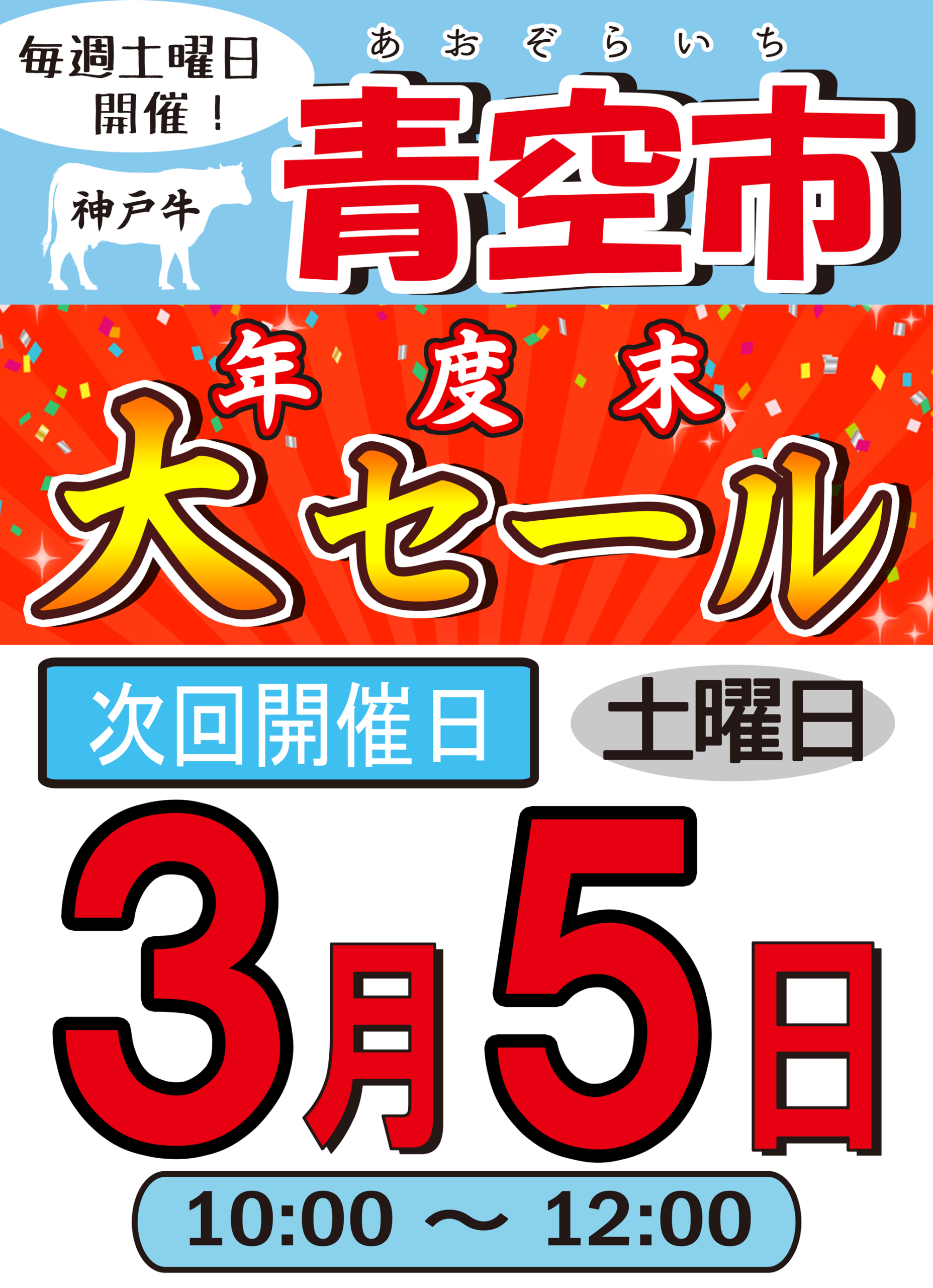 こんにちは! かんべです。 毎週土曜日恒例、ご存知!神戸ビーフ食品株式会社 青空市『年度末大セール』を開催いた