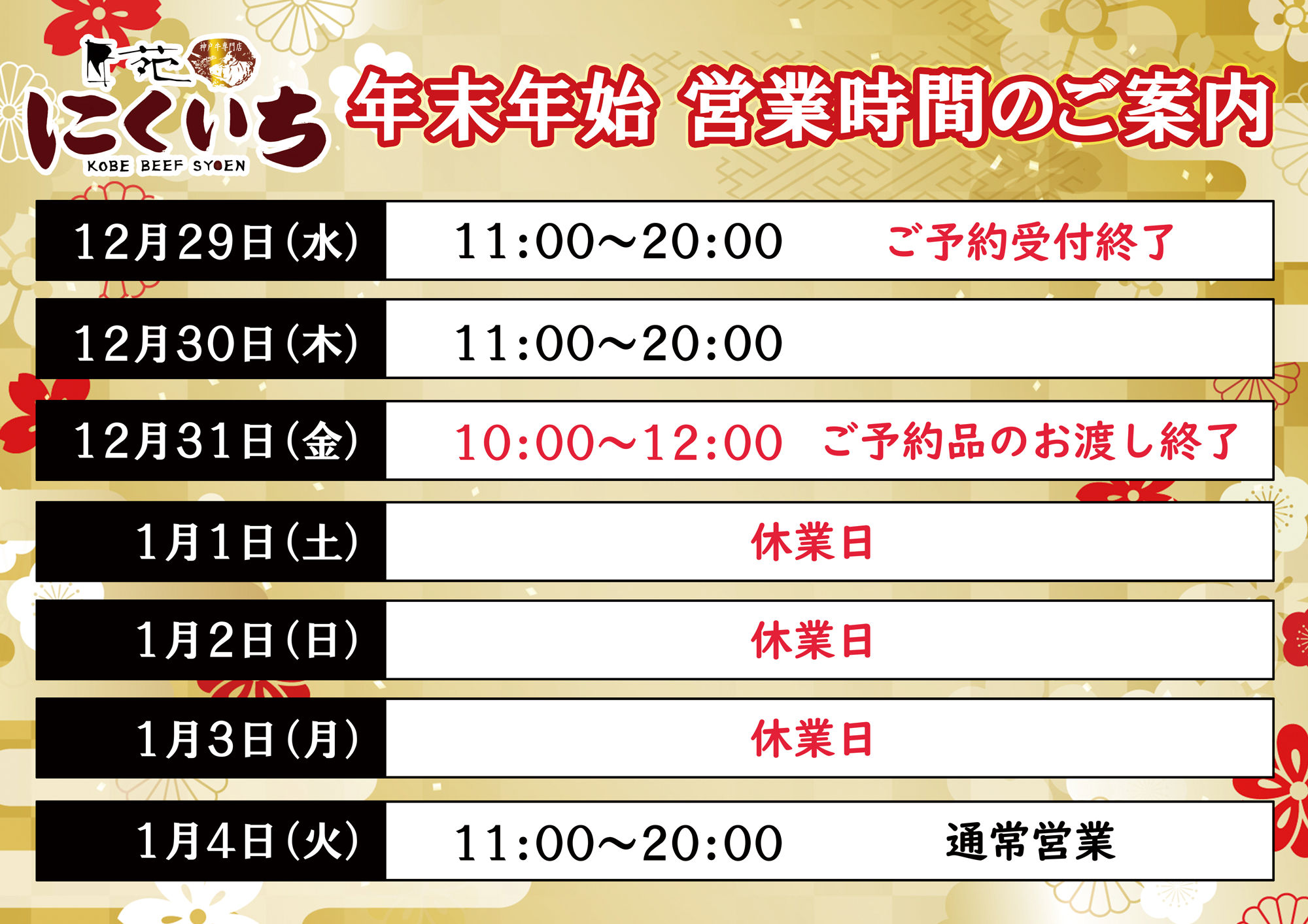 匠苑にくいち 年末年始営業時間のご案内 コメントする / 匠苑にくいち 戸田店, 神戸牛の通販 匠苑にくいち, NEWS / By かんべちゃん いつも『匠苑にくいち 戸田店・川口店』をご利用いただきありがとうございます。 誠に勝手ながら、記載の期間を休業 匠苑にくいち 年末年始営業時間のご案内 Read More »