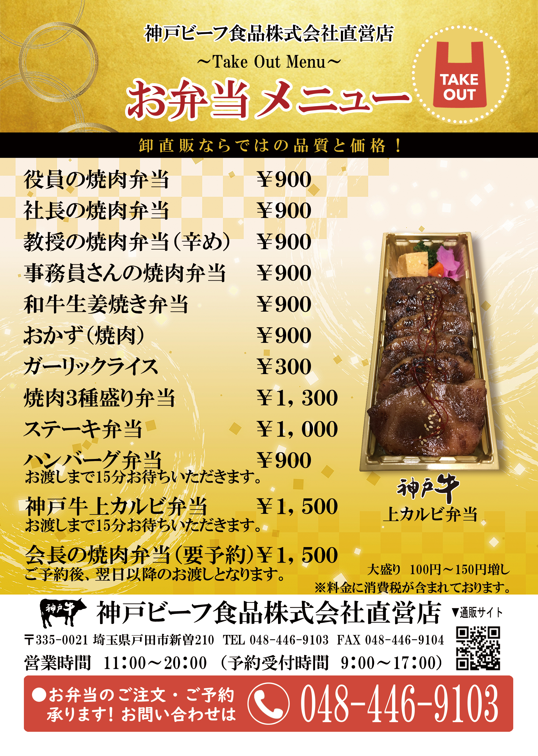 神戸ビーフ食品株式会社 直営店 お弁当メニュー表できました! コメントする / 匠苑にくいち 戸田店 / By かんべちゃん こんにちは! かんべです。 神戸ビーフ食品株式会社直営店ならではの、 品質おいしさ価格の お弁当メニュー表がで 神戸ビーフ食品株式会社 直営店 お弁当メニュー表できました! Read More »