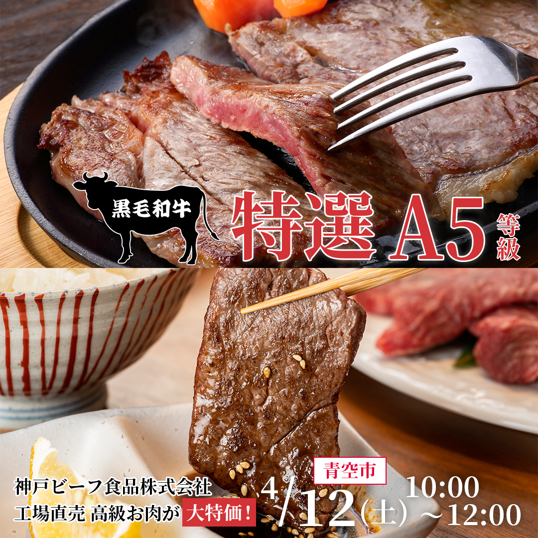 4月12日土曜日 10時から神戸ビーフ食品株式会社『青空市』開催します! 食べ方いろいろお好みで、特選 A5 黒毛和牛がおすすめです! Read More »
