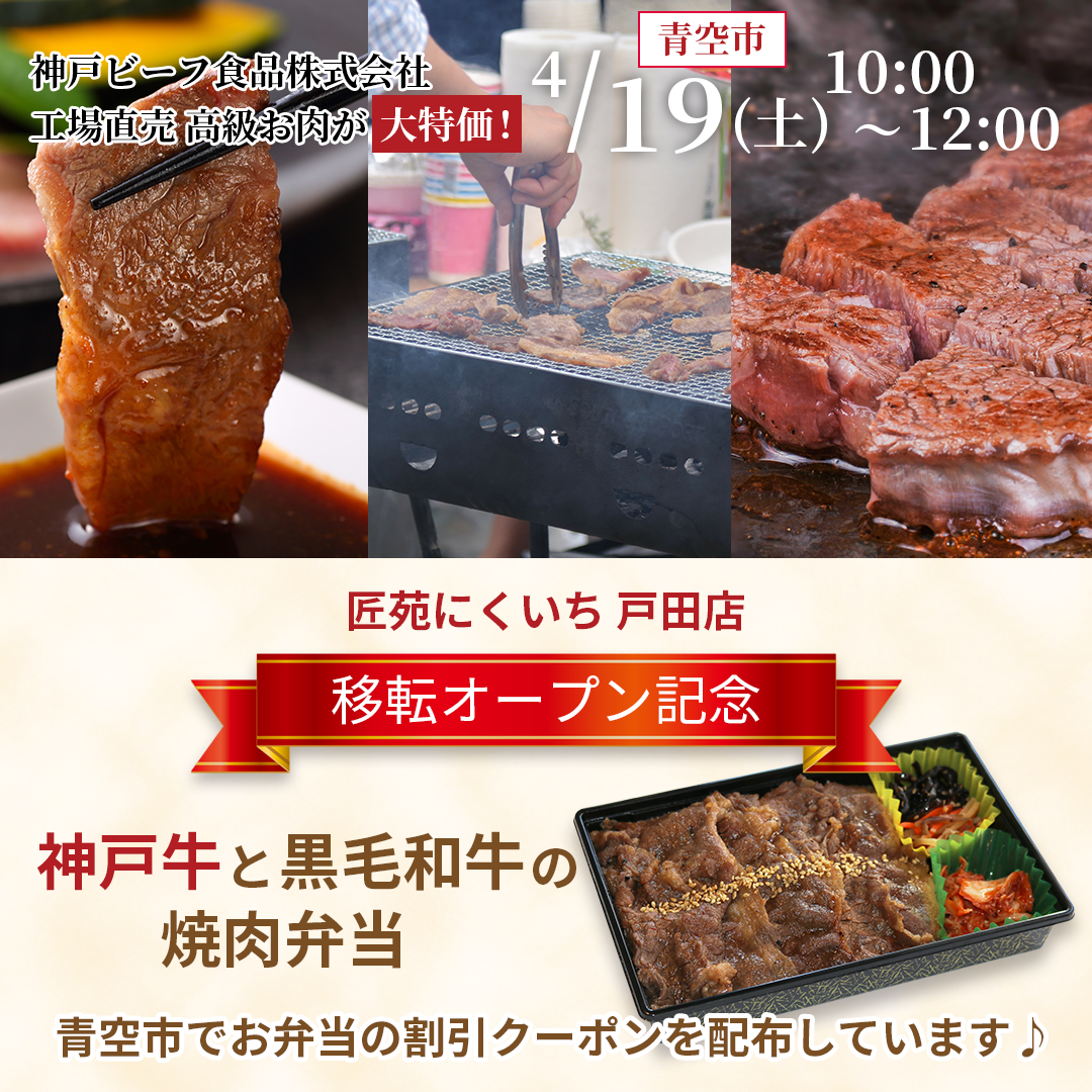 4月19日土曜日 10時から神戸ビーフ食品株式会社『青空市』開催します! 直営の焼肉弁当屋さん「匠苑にくいち 戸田店」移転オープン記念・割引クーポンを配布してます Read More »