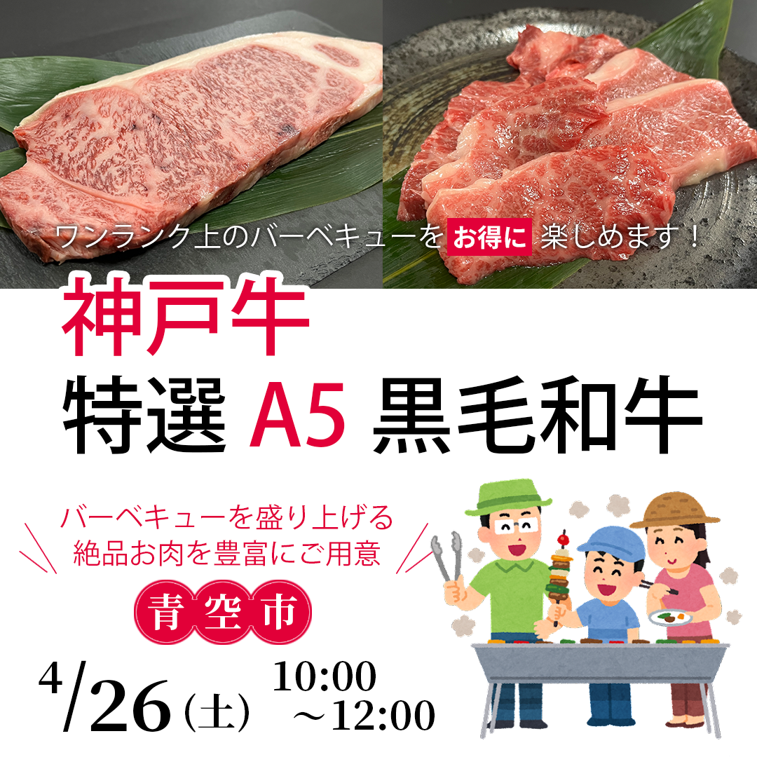4月26日土曜日 10時から神戸ビーフ食品株式会社『青空市』開催します! カルビ!ステーキ! BBQを盛り上げる絶品お肉をたくさん取り揃えました!! Read More »