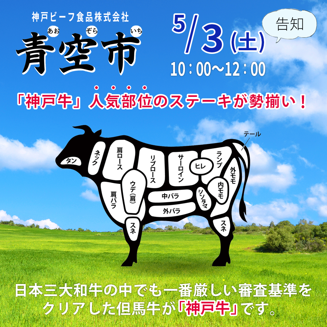 【告知】5月3日 土曜日 神戸ビーフ食品株式会社『青空市』 神戸牛人気部位のステーキが勢揃い!