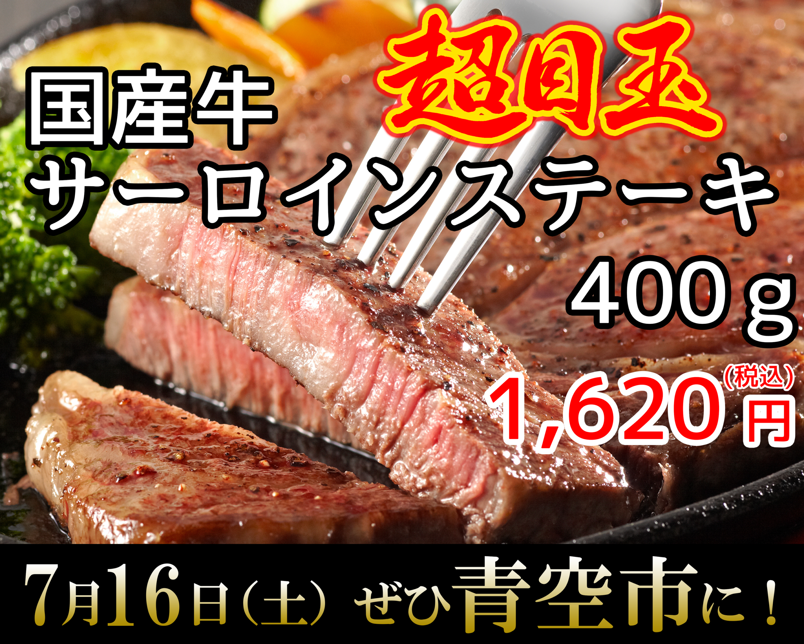 明日16日 土曜日10時から神戸ビーフ食品株式会社『青空市』開催します!超目玉商品は『国産牛サーロインステーキ400g』今週も暑さ対策で涼しい屋内で開催します