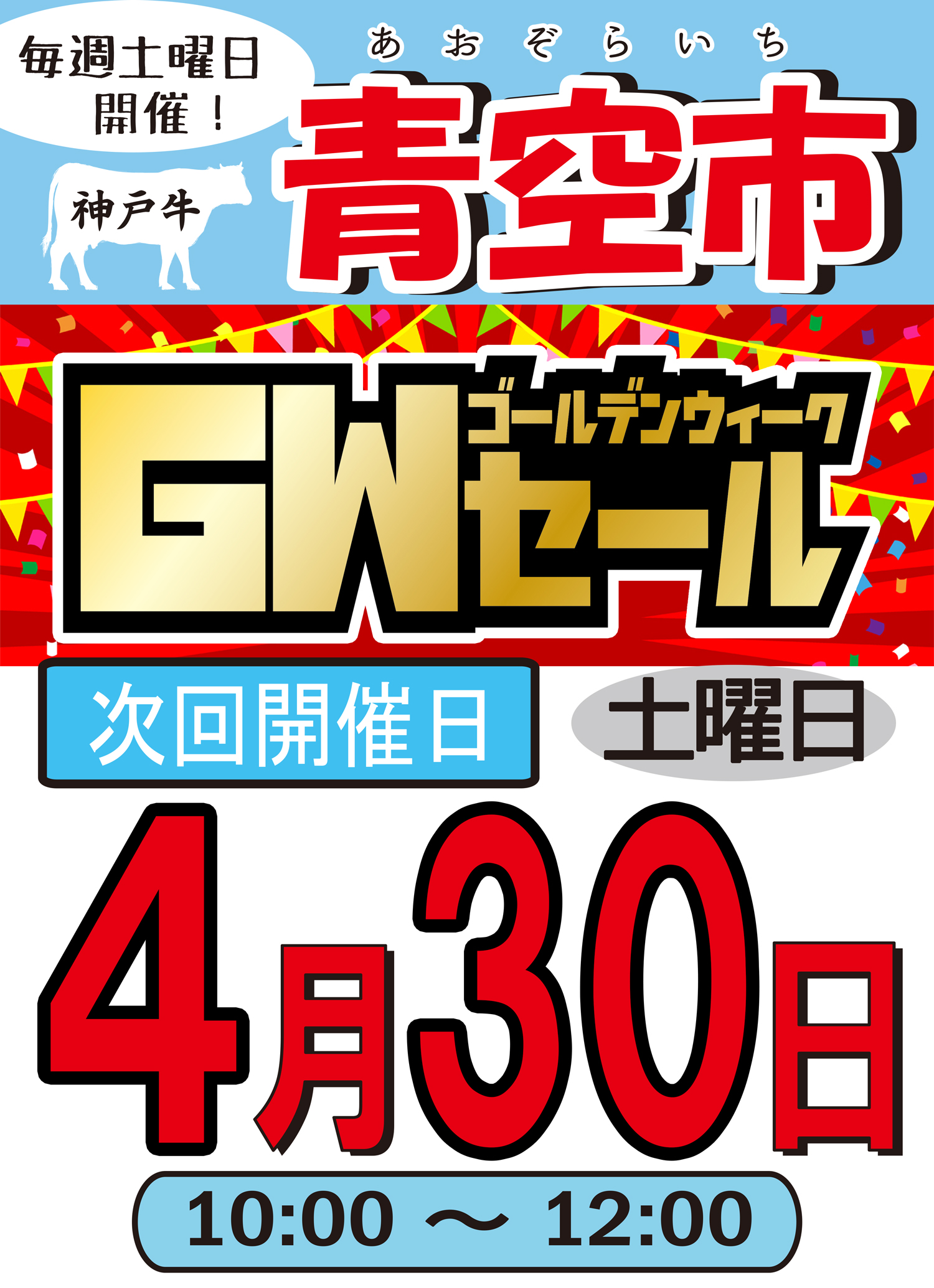 こんにちは! かんべです。 今週土曜日 4月30日 10:00から12:00まで『青空市・GWセール』を開催し