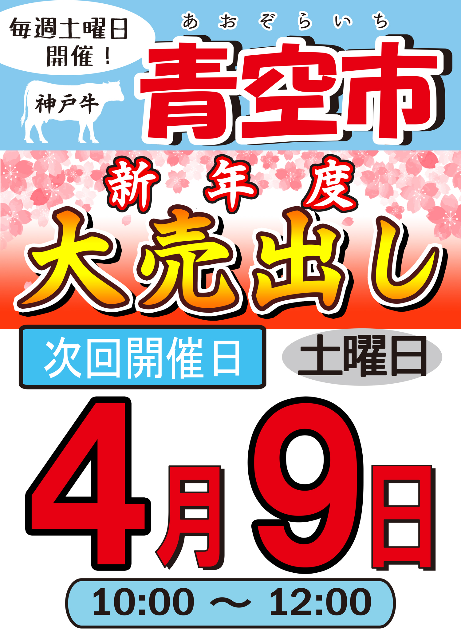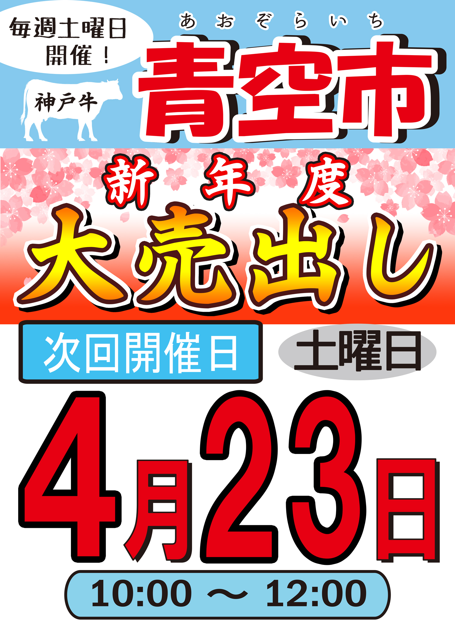 こんにちは! かんべです。 明日 4月16日 土曜日10:00から12:00まで『青空市・新年度大売出し』を開