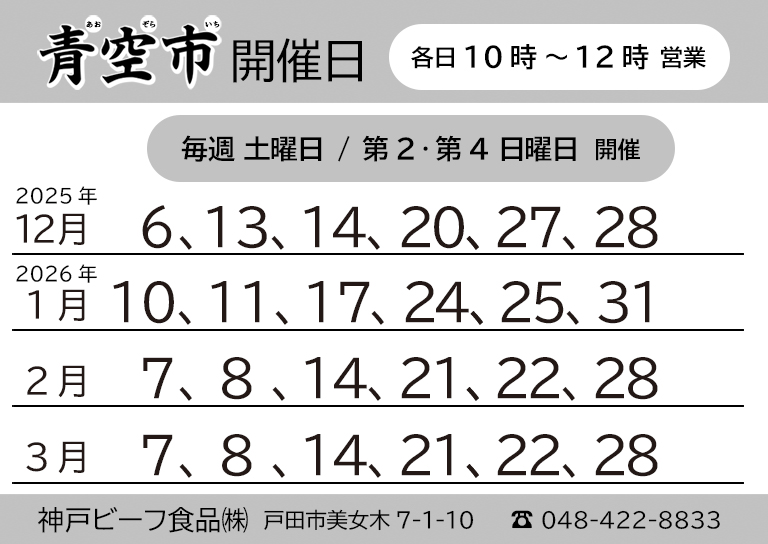いつも神戸ビーフ食品株式会社の「青空市」「匠苑にくいち」をご利用いただき、誠にありがとうございます。 年末年始
